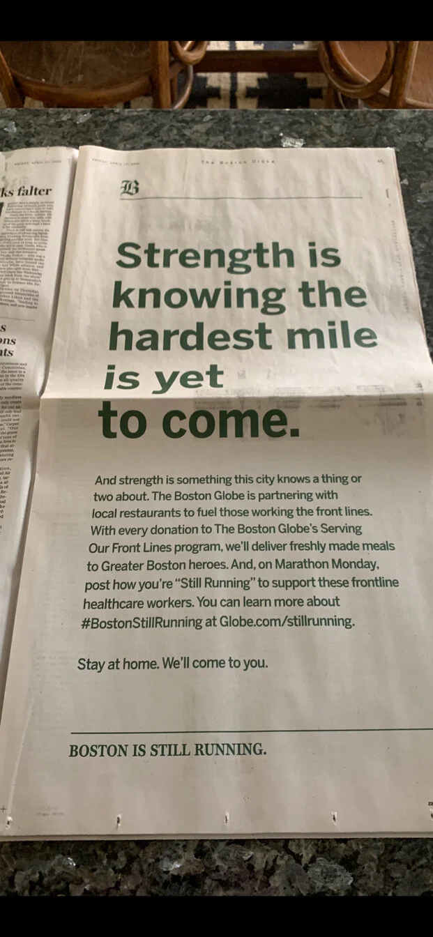 #BostonStillRunning helped the Globe donate and deliver meals to frontline workers and sought to give Bostonians a new perspective on strength. Something Boston knows a thing or two about.